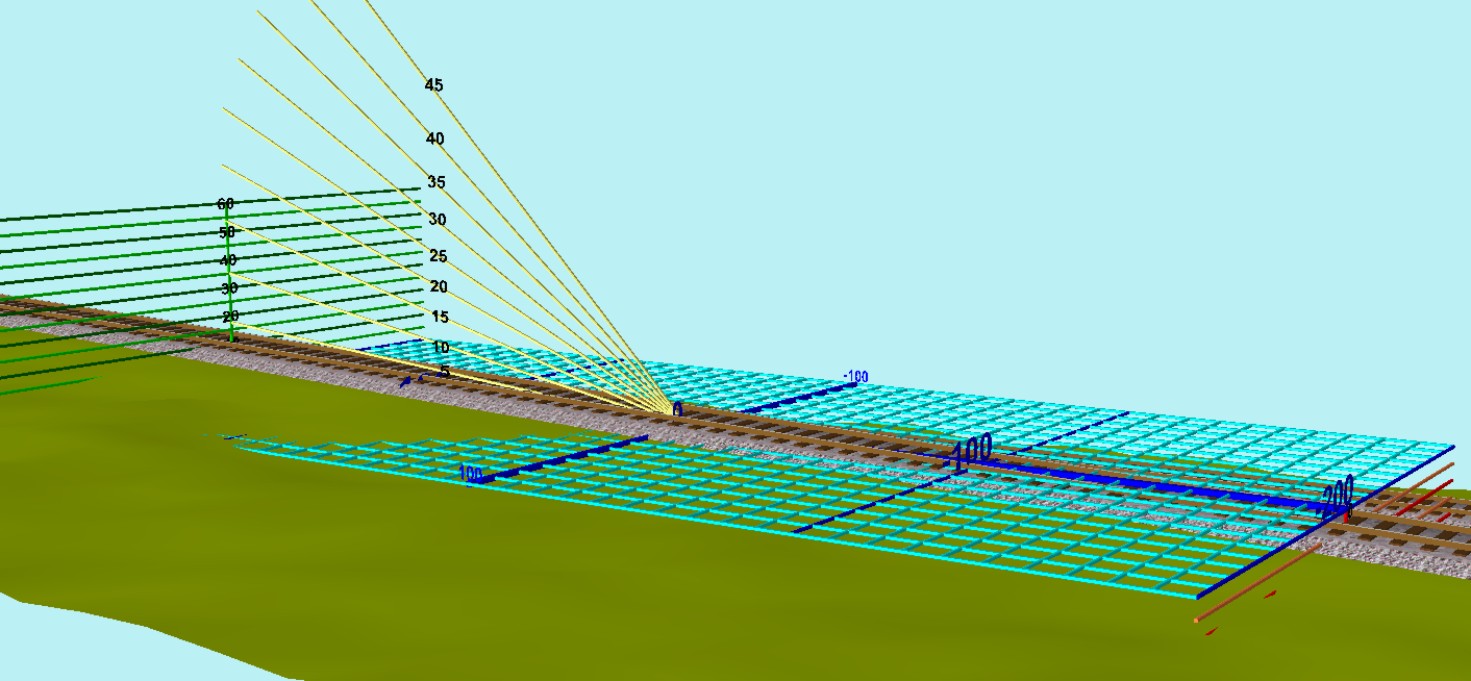 Durchfahrtshöhe für die kleine Feldbahnlok beurteilen. Durch das blaue Gitter kann die Position des rechten Brückenpfeilers genauer ermittelt werden. Ebenso kann der Böschungsverlauf besser beurteilt werden: rechts fällt das Gelände im Abstand von 200 mm vom Gleis um 45 mm ab (rot); links vom Gleis im Abstand von 200 mm besitzt das Gelände eine Erhebung von 35 mm, bezogen auf das Feldbahngleis (grün. ganz links hinter der Brücke etwas schwer erkennbar). Die Winkelschar (gelb) lässt einen Geländeanstiegswinkel unmittelbar links vom Gleis von knapp 10 Grad erkennen. Anmerkung: bei diesem Beispiel (Feldbahngleis unter einer Brücke mit Gleis) positioniert sich in WinTrack das 3D-Flächenmaß-Modell unweigerlich auf Höhe des Brückengleises, wenn man es genau mittig zur Brücke platzieren möchte (was erforderlich ist, soll die Durchfahrt unter der Brücke beurteilt werden). Ab WinTrack Version 8 kann aber das 3D-Flächenmaß relativ zu seiner Einfügeposition in der Höhe verschoben werden! Um wie viel das sein muss, kann in WinTrack ermittelt werden. Dazu lässt man sich die jeweiligen Höhen vom Brückengleis und vom Feldbahngleis anzeigen, zieht beide von einander ab, und verschiebt als dann das Hilfsmodell um diesen Betrag nach unten.