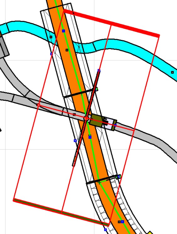 3D_Flächenmass.te3 mit TEdit3D von WinTrack erstellt | 3D Flächenmaß im 2D-Plan. Beurteilt werden soll der Geländeverlauf unter einer Brücke, wo das Feldbahngleis mit der Feldbahnlok verläuft (das Blaue ist ein Bach). |
