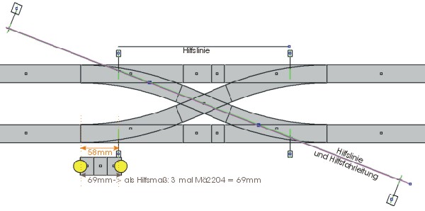 Nachdem Hilfslinien im Abstand der Hilfsmasten zu den Gleisen angelegt wurden, sowie Hilfslinien diagonal und senkrecht in den Schnittpunkten gezeichnet wurden, können die Hilfsmasten entfernt werden. |