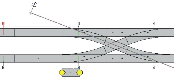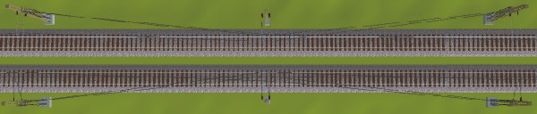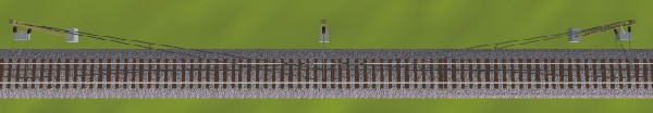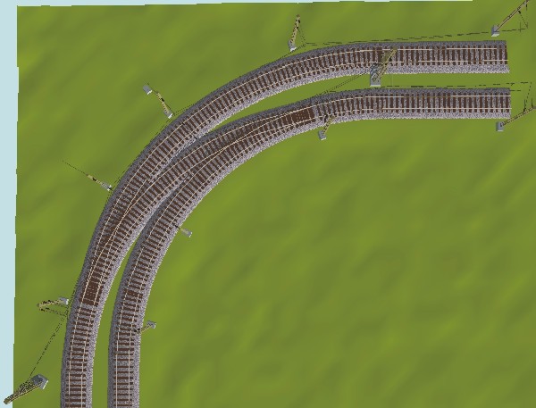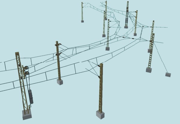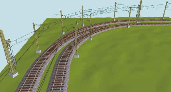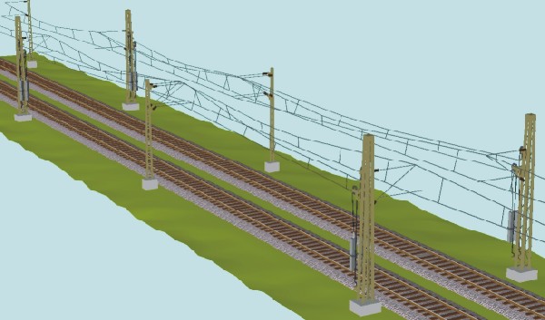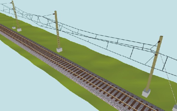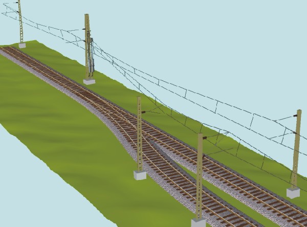 erhalten. Die hier zu sehenden Masten sind vorläufige "Hilfsmasten"; sie dienen nur zur Konstruktionshilfe. WinTrack zeigt nämlich bei Fahrleitungen an, ob diese innerhalb der Toleranz über der Schiene liegen, oder nicht. |