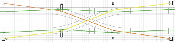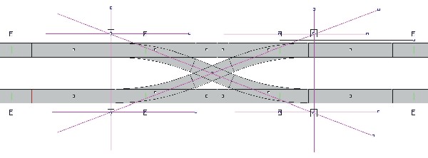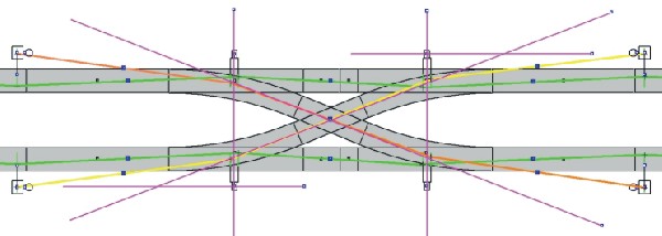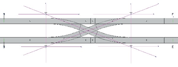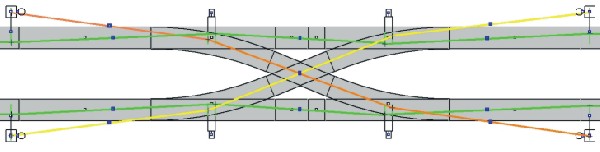 Beispiel 2: eine 2-gleisige Streck mit Kreuzung soll überspannt werden. Hier mit Masten der DB (Viessmann) in einer dem Vorbild entsprechender Ausführung für Schnellfahrstrecken (160 km/h). Die Konstruktion mittels Hilfslinien wird äquivalent dem Beispiel 1 durchgeführt und hier nicht mehr beschrieben.