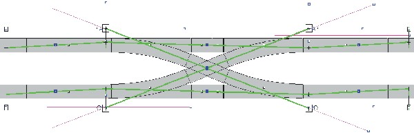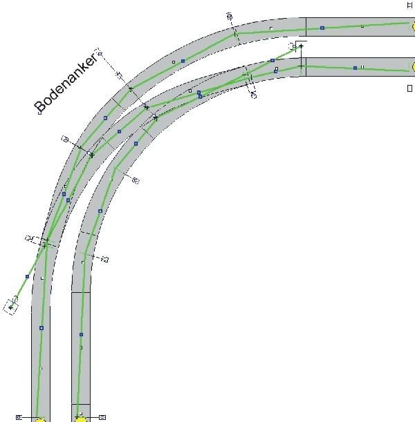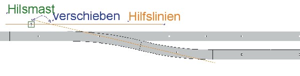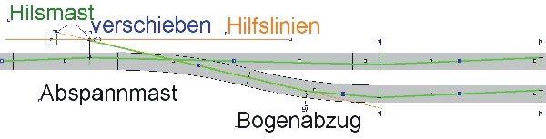 Ein Abspannmast wird als "Hilfsmast" am geraden Gleis eingefügt, um durch dessen Mittelpunkt eine zum Gleis parallele Hilfslinie zu legen. Etwa im Mittelpunkt der Weiche wird eine weitere Hilfslinie in deren Abzweig gelegt. Der "Hilfsmast" wird jetzt zum Schnittpunkt der beiden Hilfsgeraden verschoben; er wird damit zum Abspannmast mit korrekten Abständen! |