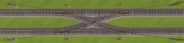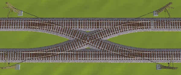 Beispiel 1: eine 2-gleisige Strecke mit Kreuzung soll überspannt werden. Hier mit Reichsbahnmasten (Viessmann) in einer dem Vorbild entsprechender Ausführung für Langsamfahrstrecken (100 km/h).