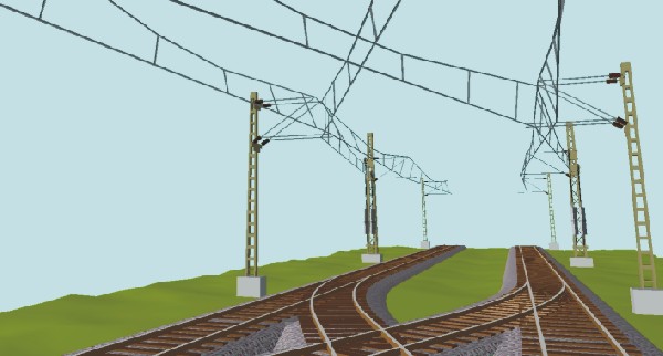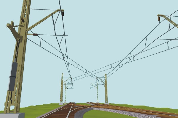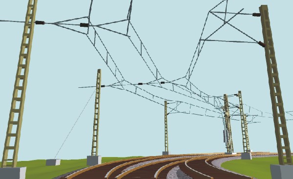 Tipp: beim Einfügen von Oberleitungsmasten in WinTrack werden die Masten (und dann auch die Fahrleitungen) der Ebene zugeordnet zu der auch die Gleise gehören. Setzt man erst nur die Masten (ohne Fahrleitungen), und markiert dann alle gesetzten Maste, um sie dann mittels "Darstellung" einer anderen Ebene, sagen wir Ebene "Oberleitung", zuzuordnen, so werden dann anschließend eingefügte Fahrleitungen an diesen Masten automatisch auch der Ebene "Oberleitung" zugeordnet. Damit kann dann im Ebenenmenü von WinTrack in der 3D-Darstellung die Gleisdarstellung unterdrückt werden, und nur die Oberleitung zur Ansicht gebracht werden, wie hier links gezeigt. Vorteil: Details der Oberleitung sind nicht durch Gleise in ihrer Ansicht gestört. |