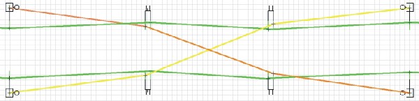 Ähnlich wie Beispiel 5, nur mit drei Feldern. Zu beachten: die Kreuzungen der Fahrleitungen (am oberen Parallelgleis farbig hervorgehoben)! |