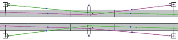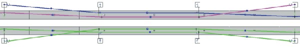 kommende Fahrleitung (hier magenta dargestellt) und die von rechts (grün)