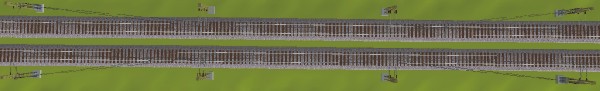Vogelperspektive. Jeweils links und rechts von diesem Gleisausschnitt befinden sich (nach einigen normalen Streckenmasten) jeweils die Festpunkte (siehe Beispiel 4) |