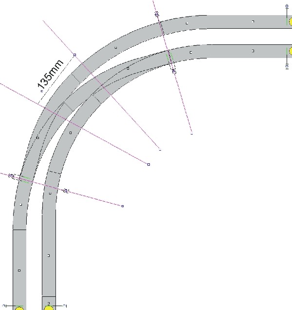 Masten mit Doppelauslegern gesetzt. Für den Maßstab H0 wählt man eine Hilfslinie von ca. 135mm tangential im Mastabstand zum äußeren Bogengleis. Dazu radial, jeweils durch die Endpunkte der 135mm Hilfslinie zwei weitere Hilfslinien. |