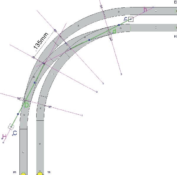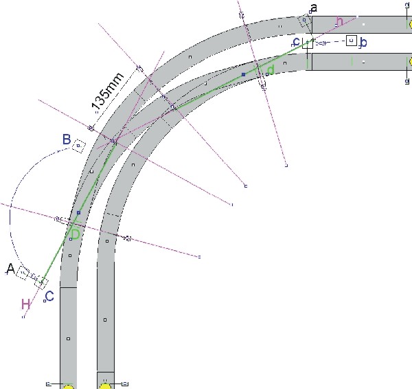 Bogenabzügen positioniert: einer mit zwei Abzügen und einer mit drei. Mittels bekannter Hilfs-Fahrleitungen und -Linien findet man die korrekten Positionen der Fahrleitungen über den Abzweiggleisen. Ein Abspannmast mit Ausleger wird ans Gleis gesetzt, Punkt B (bzw. Punkt b); dieser wird dann über Punkt A (a) nach Punkt C (c) auf die Hilfslinie H (h) zu seiner endgültige Position verschoben und gedreht. Von Punkt C über Punkt D (von c über d) wird nun die Fahrleitung zum Bogenabzug gespannt. |