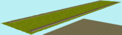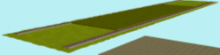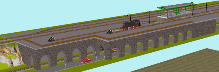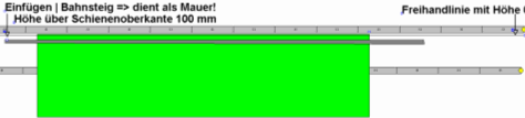 Anschließend weisen wir ihr eine Höhe Null zu. Und nun kommt der Trick: wir verwenden die Funktion "Bahnsteig..." (Menüleiste "Einfügen") und erzeugen damit eine Linie entlang der Außenkante des Gleises mit der Höhe 100. In die Registrierkarte wird eingetragen: maximale Bahnsteigbreite =10, dann besitzt die Stützmauer eine Stärke von 10 mm; Abstand Gleismitte zu Bahnsteigkante 15 mm (gilt für H0, ist halbe Trassenbreite), damit liegt die Stützmauer hart an der Außenseite der Trasse; Höhe über Schienenoberkante 100, damit erhält die Stützmauer eine Höhe von 100 ("Bahnsteig" 1) Weiterhin kann noch eine Ebene hinzugefügt werden, ebenfalls mit der Funktion "Bahnsteig". Hierbei wird die "Bahnsteiglinie" längs des unteren Gleises verlegt, als maximale Beinsteigbreite wählt man den Abstand beider Gleise, und als Höhe den kleinsten Wert von 1 mm ("Bahnsteig" 2). Das Ergebnis sieht dann so aus:
