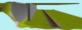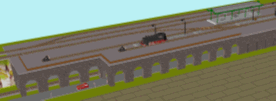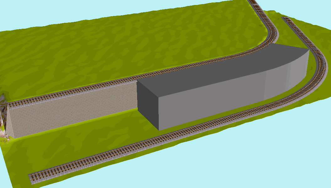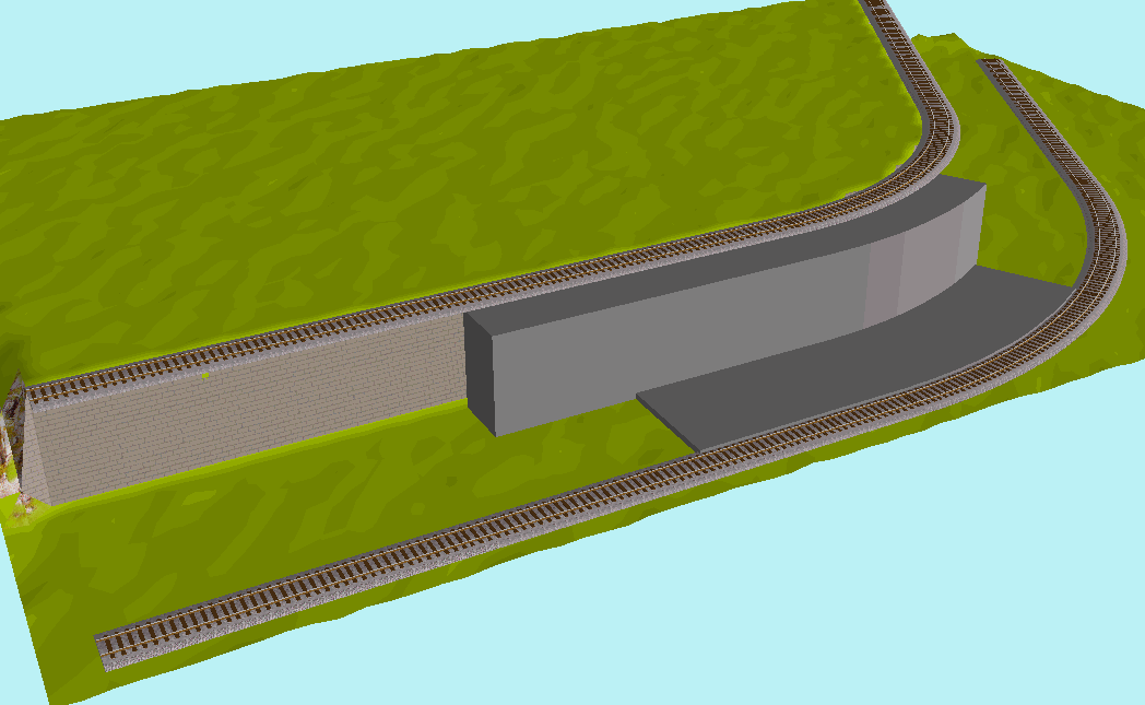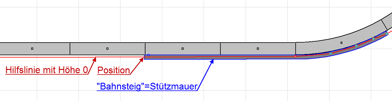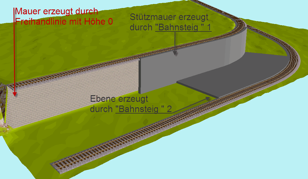 Anmerkung: werden Stützmauern in Steigungsbereichen benötigt, ist das Verfahren im Prinzip das Gleiche, nur teilt man hier die Stützmauer in mehrere Teilmauern auf. Je feiner die Aufteilung, desto exakter die 3D-Darstellung. Die erforderlichen Höhen entnimmt man dem 3D-Profil des Steigungsgleises. Reale Bahnsteige lassen sich in WinTrack auch an Gleisen im Steigungsbereich erzeugen; bei zweckentfremdeter Bahnsteigs-Funktion für Stützmauern funktioniert dies nicht ohne weiteres.