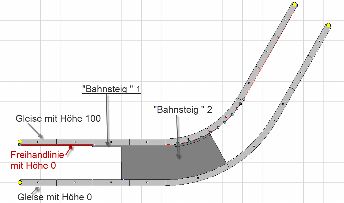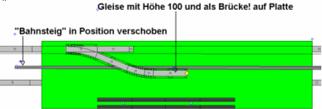 Das Prinzip, also die Vorgehensweise aus obigen Tipp 2 lässt sich auch auf andere Probleme anwenden. In der Wintrackversion 13 wurde die Funktion zur Erzeugung von Bahnsteigen erweitert (Einfügen | Bahn-/Bürgersteig...); leider ist es bei diesen selbst erzeugbaren Bahnsteigen (und Bürgersteigen) nicht möglich ihnen ein Höhe zuzuweisen. Auch Zuweisung als "Tunnel" hilft hier nicht weiter, um selbst erzeugte Bahnsteige (bzw. Bürgersteige) in den Untergrund zu verbannen. Mit einem Trick, ähnlich des Tipps 2, gelingt dies dennoch! Dies soll nun gezeigt und an einem kleinen Gleisplan demonstriert werden: