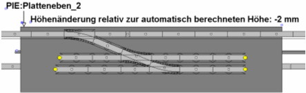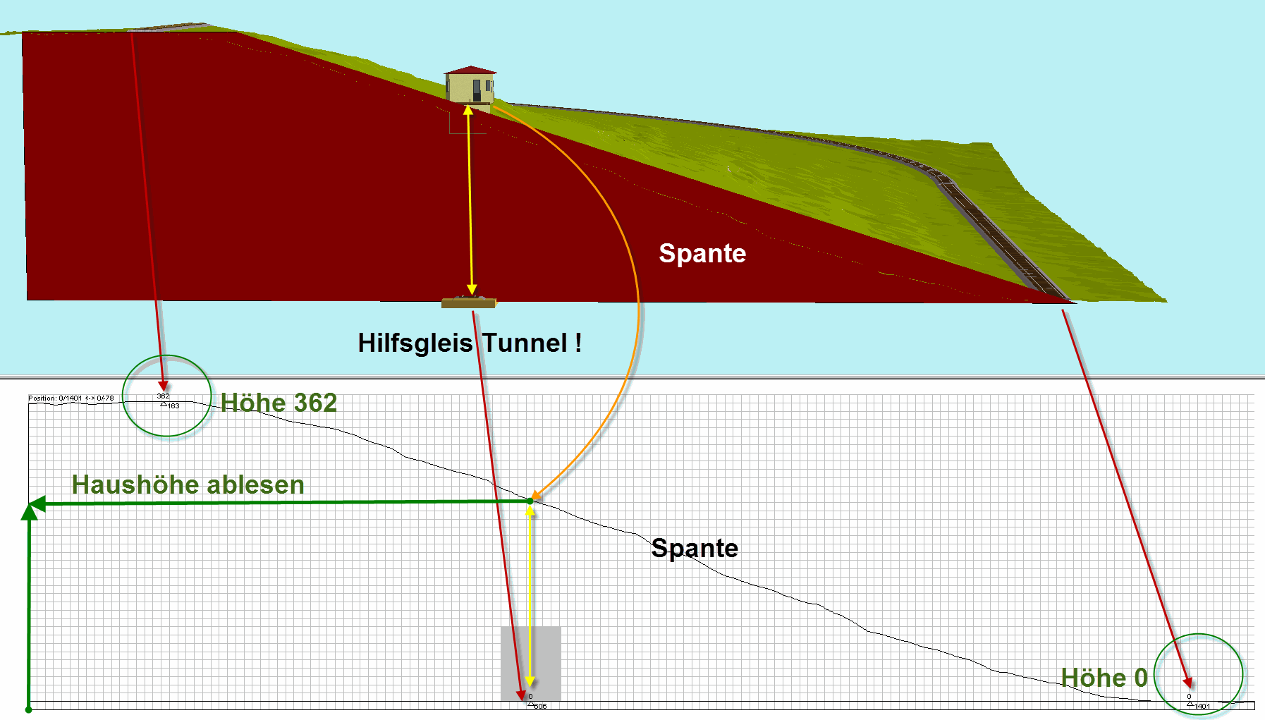 In der Spantenansicht kann nun mit Hilfe der Gitterlinien und den darin angegebenen Gleishöhen die absolute Haushöhe ermittelt werden.