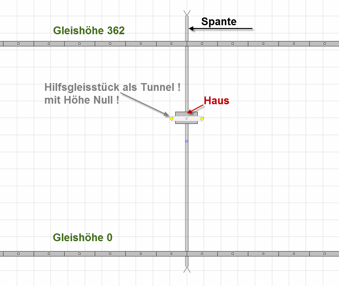 2. Man fügt ein Gleisstück genau beim Haus ein, und zwar als Tunnel (!) mit Höhe Null (!).