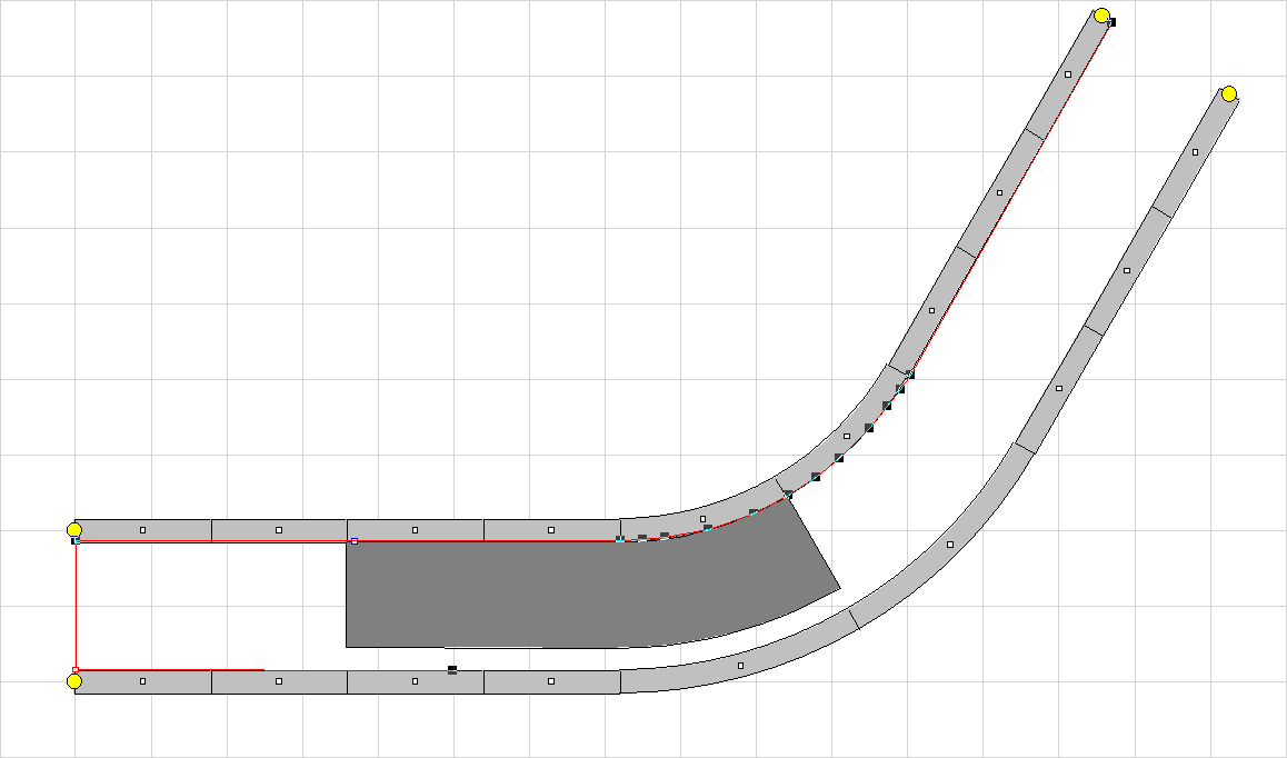 Mit einem Trick kann man aber WinTrack veranlassen senkrechte Stützmauern in der 3D-Ansicht zu erzeugen. Dies soll an Hand eines kleinen Gleisbildes gezeigt werden. Wir wählen zwei Gleisstrecken, eine mit Höhe Null und eine zweite mit Höhe 100. Weiterhin benötigen wir eine Freihandlinie, welche wir knapp außerhalb und parallel zum Gleis mit Höhe 100 verlaufen lassen, siehe folgende Abbildung: