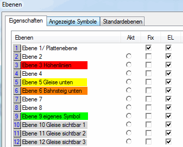 Zeichenebenen 10,11, und 12 [grau] 1 Gleis ist eine Tunnelstrecke (nicht sichtbar, Höhe -120), Zeichenebene 5 [gelb] Der selbst erzeugte Bahnsteig befindet sich in Zeichenebene 6 [orange] Eine "Plattenabdeckung" (selbst erzeugtes 3D-Objekt) ist in Zeichenebene 9 [grün] Erforderliche 3D-Höhenlinien befinden sich in Zeichenebene 3 [rot] Zu beachten ist die Reihenfolge der Zeichenebenen mit ihren Objektinhalten: so gewählt, damit im 2D-Gleisplan Sichtbares auch zu Oberst dargestellt wird! Um die gewünschte 3D-Ansicht zu erhalten, sind ein paar Besonderheiten (Tricks) zu beachten, die nachfolgend beschrieben werden. |