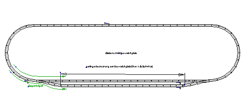Wir fügen ein Ausweichgleis ein. Nun können wir bereits maximal 3 Züge fahren lassen. Die Weichen des Ausweichgleises sind aber nicht sehr geschickt gewählt: sie verursachen Gegenbögen und verkürzen den verfügbaren Gleisbereich im Bahnhof. |