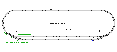 Wir positionieren die Weichen anders. Jetzt durchfahren die Züge die Weichen ohne Gegenbögen und die Gleislänge innerhalb der Ausweichstelle (Bahnhofsbereich) ist wesentlich größer bei gleichem Platzbedarf der Anlage. |