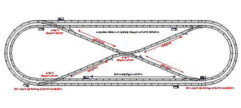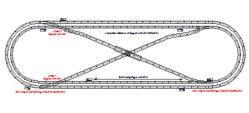 Um den Zugbetrieb interessanter zu gestalten, möchten wir jetzt Züge vom äußeren Parallelkreis auch in den innen Parallelkreis fahren lassen können, und umgekehrt. Dazu bauen wir zwei Kehren ein. Leider mit vielen Nachteilen (rot markiert): an vielen Stellen wird der Gegenverkehr gekreuzt und damit behindert; viele Signale sind erforderlich, um die Strecken abzusichern und diese Streckenabschnitte sind zudem noch viel zu kurz. |