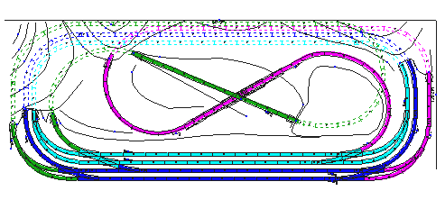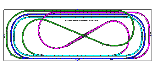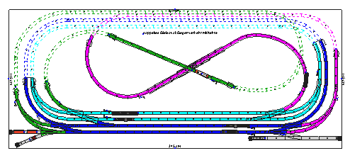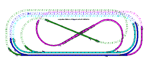 Einen kleinen Schönheitsfehler hat unser Kreis noch: es ist ein Kreis! In der Realität wird ein Zug einen Bahnhof nicht östlich verlassen und dann nach einiger Zeit den Bahnhof westlich wieder erreichen. Bei den Kehren ist dies Problem an sich bereits beseitigt. Verbleiben also noch innerer und äußerer Parallelkreis. Aber auch diese Kreise (blau und cyan) kann man ähnlich den Kehren gestalten, sodass Züge immer wieder aus der Richtung zum Bahnhof zurückkehren in der sie ihn auch verlassen haben. Und damit viel Spaß beim Ändern vom Kreis zur Anlage! |