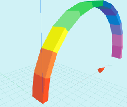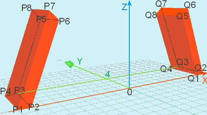 Wir weisen unserem Rundbogen noch Breite von 4 LE zu und erkenn, dass die Punkte P1, P2, P5 und P6 alle eine y-Koordinaten von 0 haben; die Punkte P3, P4, P7 und P8 alle eine y-Koordinate von 4 haben (das gleiche gilt auch für die Q-Punkte). Acht geben müssen wir jetzt nur noch auf die Reihenfolge der Punkte in der wir diese in den Hexaederbefehl eingeben, denn sonst stimmen später die Farben nicht! Der Befehl in TEdit3D lautet: