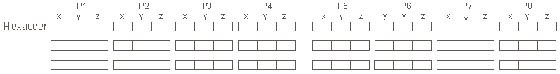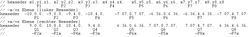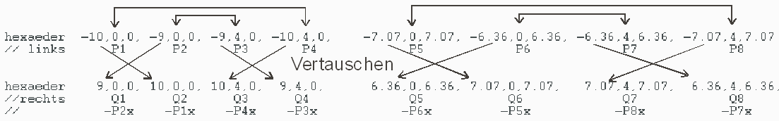 Man braucht sich also lediglich die Koordinaten der Hexaeder im linken Viertelkreis zu verschaffen, dann entsprechende Vorzeichen einfach umzukehren, und die Punkte kreuzweise vertauschen, um die Hexaeder in richtiger Reihenfolge für die rechte Seite zu bekommen. Die eckigen Pfeilklammern kennzeichnen Punkte mit gleichen x/z-Koordinaten, die sich nur in der y-Koordinate unterscheiden. Dieses Wissen kann man dazu verwenden um (a) richtige Reihenfolge der Punkte, (b) schnelles Erstellen der rechten Hexaeder durch Kopieren, Vorzeichenwechsel und Vertauschen der Koordinaten von linken Hexaedern, (c) schnelle Überprüfung auf Fehler zu erreichen. Diese Arbeit wird leichter, wenn man im Listing zwischen den einzelnen Punkten entsprechende Leerzeichen einfügt, damit die Darstellung übersichtlich wird.