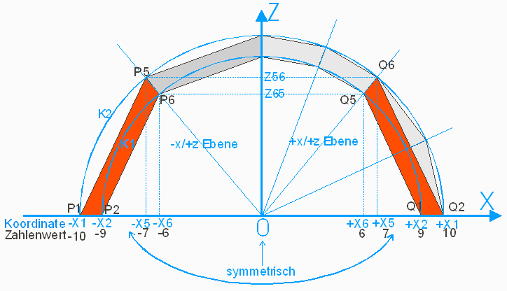 Der exakte Rundbogen wird durch die beiden blauen Halbkreise K1 und K2 dargestellt, die in der x/z-Ebene liegen. Wir teilen den linken Viertelkreis in der Mitte auf: Punkt P5 und P6. Damit erhalten wir unseren ersten rot dargestellten Hexaeder in einer seitlichen Ansicht mit den Punkten P1,P2,P6,P5. Haben wir unseren Rundbogen auf Millimeterpapier gezeichnet, können wir die ersten x-Koordinaten dort ablesen oder ausrechnen: P1= -10, P2= -9, P5= -7.07, P6= -6.36. Da wir geschickter Weise unseren Halbkreisbogen symmetrisch zum Koordinatenursprung gelegt haben, sehen wir, dass der rechte Bogen symmetrisch zum linken ist. Damit stehen uns auch die x- Koordinaten des rechten Hexaeders schnell zur Verfügung: Q1= +9, Q2= +10, Q5= +6.36, Q6= +7.07. Die z-Koordinaten für P1, P2, Q1, und Q2 sind jeweils 0; die z-Koordinaten von P6 und Q5 sind 6.36, die von P5 und Q6 sind 7.07. Zu den y-Koordinaten kommen wir später, wir betrachten momentan nur die 2-dimensionale x/z-Ebene! Wir erkenn, dass unser Bogen noch ziemlich eckig ist. Eine nochmalige Unterteilung (rechtes Kreisviertel, hell grau eingezeichnet) würde sich dem Bogen bereits besser anpassen. Aber uns geht es hier erst einmal um das Prinzip Hexaeder und wir bleiben bei der groben Darstellung und wenden uns den letzten noch fehlenden y-Koordinaten zu: