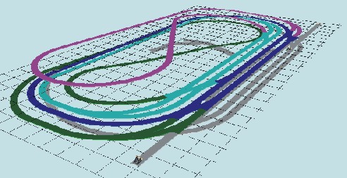 2. Zweigleisiges Oval (Gegenverkehr) mit zwei Wendeschleifen, um vom äußeren in den inneren, und vom inneren in den äußeren Parallelkreis zu gelangen.