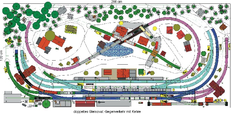 1. Trotz relativ kleiner Grundfläche von 260cm x 120cm in H0 stellt der Gleisplan eine schon recht komplexe Anlage dar.