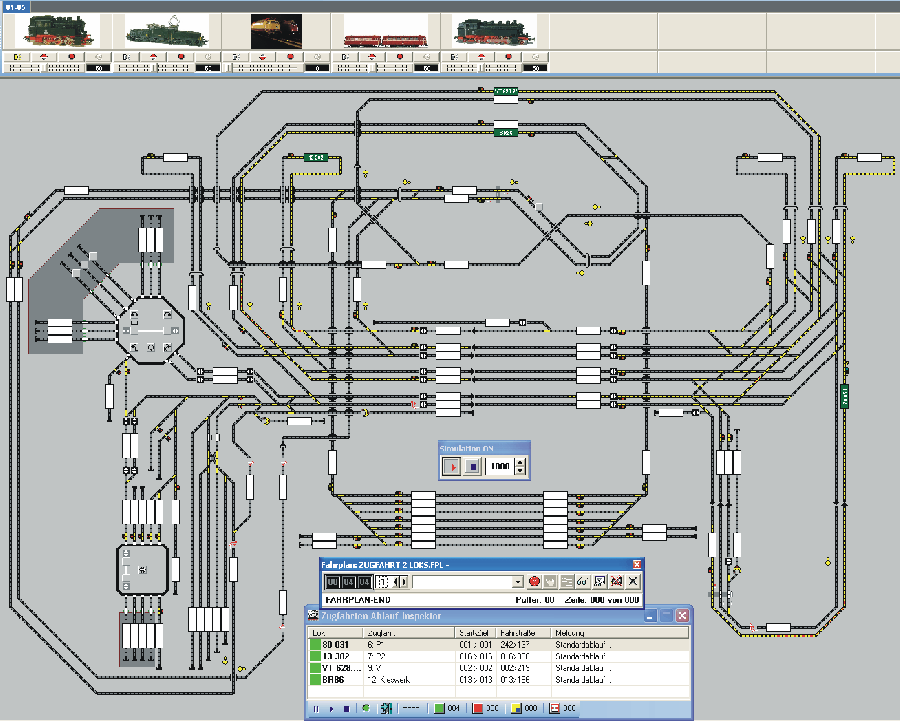 Der Screen-Dump zeigt die Simulation eines Fahrplanbetriebs von 4 Zügen.