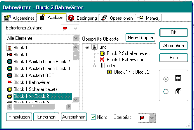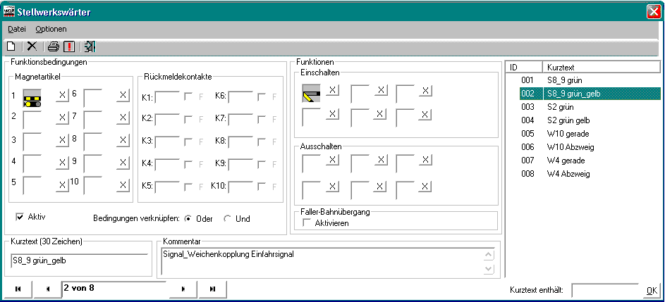 Trägt man hier, wie in der obigen Abbildung, grün umrandet und blau markiert, dargestellt die Verknüpfungen ein, so folgt bei der Zugfahrtsimulation der Signallichtwechsel auch der Weichenstellung (Signal grün -> Weiche gerade; Signal grün/gelb -> Weiche auf Abzweig).