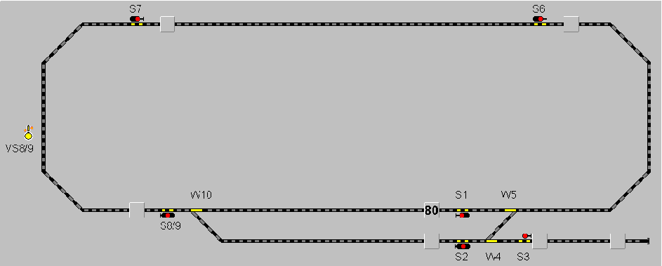 Nehmen wir wieder obiges Gleisbild und betrachten das dreibegriffige Signal S8/9 mit Vorsignal VS8/9 und zugehöriger Weiche W10.