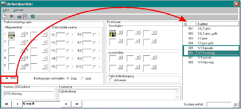 Dabei muss noch jeder einzelne Eintrag im Stellwerkswärter-Fenster aktiviert oder deaktiviert werden, und dies auf umständliche Weise: ständiges Hin- und Herfahren mit der Maus, im Fenster rechts gewünschte Zeile markieren, Mauszeiger im Fenster nach links unten bewegen und Haken setzen (oder entfernen). Einfacher und damit schneller bedienbar wäre eine Spalte neben der ID-Spalte zu haben, in der man direkt die Haken setzen (oder entfernen) könnte! (siehe roten Pfeil in der obigen Abbildung).