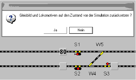 Ist unter diesen Einstellung eine „Zugfahrten-Automatik“ per Simulation vollständig abgelaufen, man schließt „Zugfahrten-Automatik“, und danach die Simulation und wählt „Gleisbild und Lokomotiven auf den Zustand vor der Simulation zurücksetzen“ mit „Ja“, dann wird manchmal das im Gleisbild auf rot (korrekt) stehende Signal S2 auf grün gestellt, was aber vor der Simulation nicht der Fall war! Gezielt reproduzieren ließ sich dieser Fehler nicht. Wie im Handbuch eben zu lesen ist: „manchmal passieren merkwürdige Dinge“!