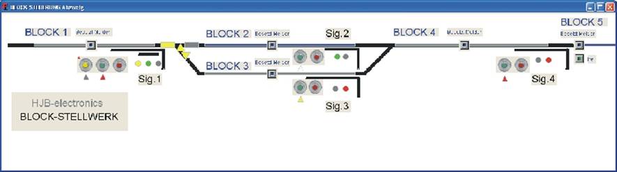 Abbildung 1 zeigt das BLOCK-STELLWERK. Wir erkennen BLOCK 1 mit dem Einfahrtssignals 1 in einen Bahnhof. Der kleine Bahnhof besitzt zwei Gleise, BLOCK 2 mit Ausfahrtssignal 2 und BLOCK 3 mit Ausfahrtssignal 3. Beide Ausfahrtsgleise münden in die Strecke mit BLOCK4 und dem zugehörigen Block-Signal 4. BLOCK 5 ist nur noch angedeutet und wird bei der Simulationsbetätigung benötigt, um BLOCK 4 auch wieder frei geben zu können (bei einer realen Anlage würde der Fahrweg ja weiter führen).