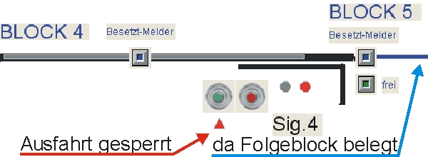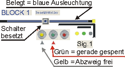 Ist Block 2 oder Block 3 als belegt gemeldet und sollte dann das jeweils zugehörige Signal auf Fahrt und dann manuell auf Rot (Halt) gestellt werden, dann wird der Block automatisch auf „nicht belegt“ zurückgeschaltet und muss manuell wieder auf „belegt“ gesetzt werden; auf einer realen Anlage würde dies nicht erforderlich sein, da ein dort verbleibender Zug den Kontakt sofort wieder einschalten würde – in der Simulation müssen Sie dies übernehmen! (könnte man mit vermehrtem schaltungstechnischen Aufwand auch verbessern).