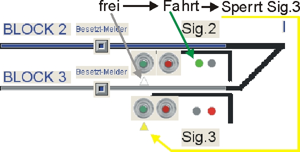 Während der erste Zug im Block 2 vor S2 hielt, hätte das Signal S1 für einen nachfolgenden Zug auf HP2 (orange, Abzweig) zu Block 3 gestellt werden können.