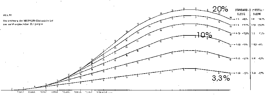 Nachfolgendes habe ich mehr aus historischen Gründen eingefügt. Die hier angegebenen Steigungen sind nicht mehr zeitgemäß. Damals begenügte man sich mit kleinen Zuglängen und es handelte sich meist mehr um Spielbahnen. Steigungen von mehr als 4% sollten nicht verwendet werden.