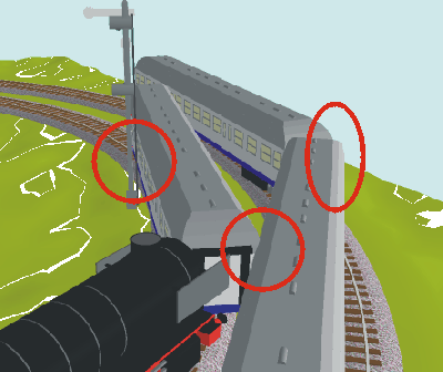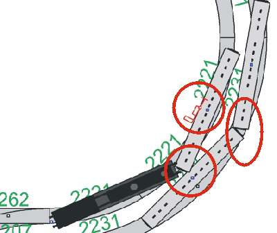 Thema Radien, gebogene Gleise. Bei kleineren Anlagen ist man gezwungen mit engen Radien vorlieb zu nehmen. Dies schränkt die verwendbaren Lokomotiven und Wagons ein. Ganz besonders ist in Krümmungen auf 2-gleisigen Strecken auf den Gleisabstand zu achten! Verwendet man z. B. die MÄRKLIN Gleise der Radien R1=360mm und R2=437,5mm im normalen Parallelgleisabstand, so kann es bei der Begegnungen von langen D-Zugwagen im Maßstab 1:87 auf der Strecke zu Berührungen kommen (wenn überhaupt, dann 1:100 Wagons verwenden); auch muss man hier auf einen größeren Abstand von Signalen zum Gleis achten (Ausscheren der langen Wagen)! Auch hier ist ein Testaufbau der sicherere Weg.